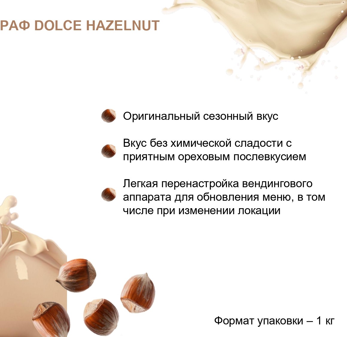 - Доставка в регионы осуществляется логистическими компаниями.Продукт растворимый на основе растительного сырья «Raf-Dolce Hazelnut» со вкусом лесного ореха.